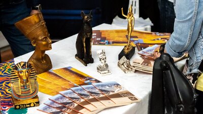 Cultural highlights include a live Egyptian folkloric dance performance and a short video presentation showcasing the Grand Egyptian Museum - the world's largest museum dedicated exclusively to Egyptian civilization. Visitors can experience authentic Egyptian street food while children enjoy a hands-on cultural activity learning to write their names in hieroglyphics.