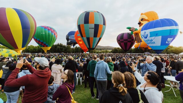 Enjoy a magical morning at the CanberraBalloon Spectacular as hot air balloons rise over the city skyline at dawn, capturing the hearts and imaginations of all ages.